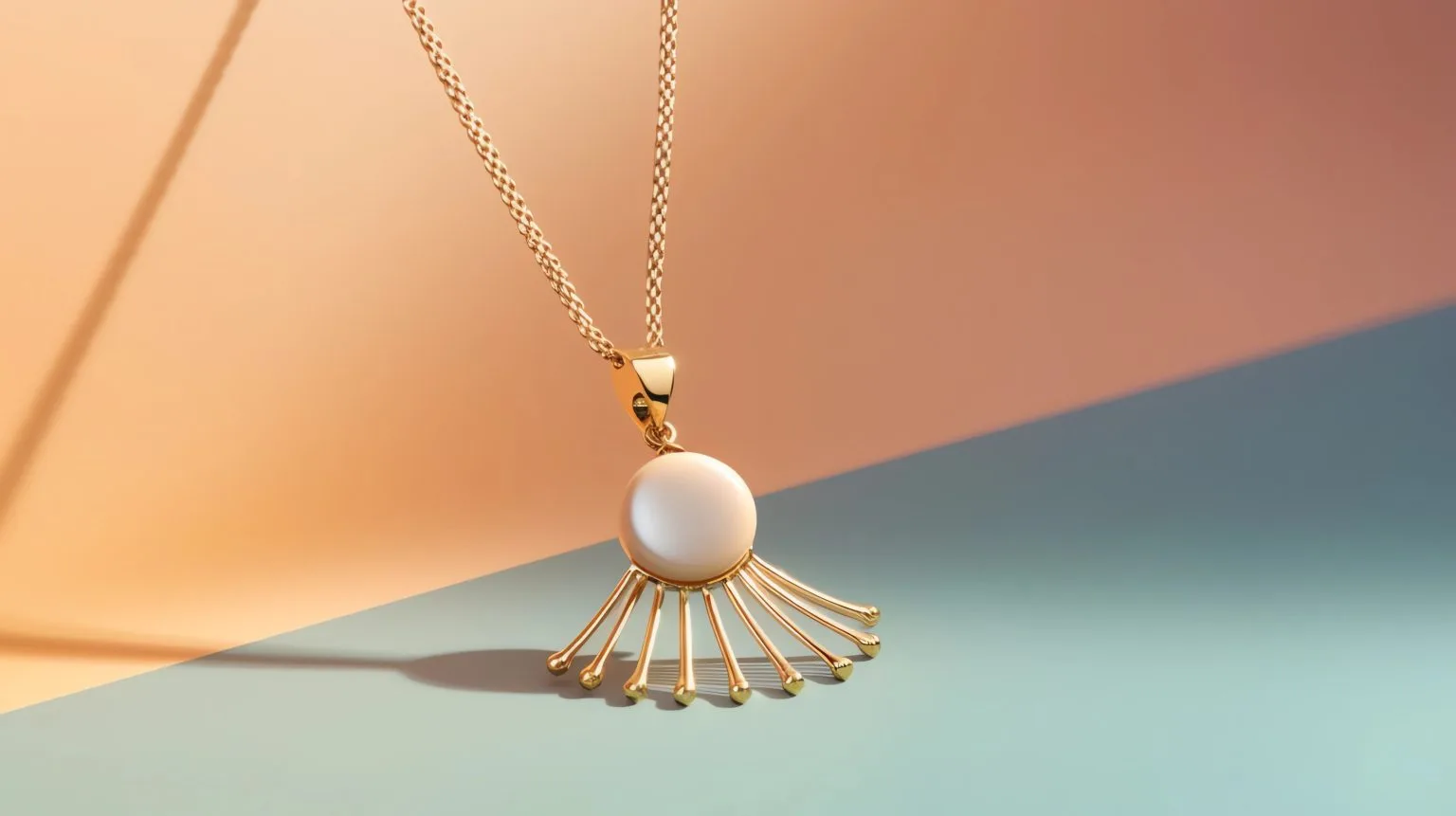 a golden necklace, editorial, rays of sunlight, pastel colors, professional photography, minimal background